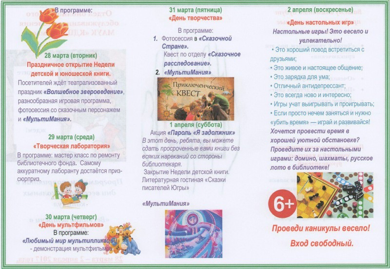 В дни весенних каникул с 28 марта по 2 апреля отдел библиотечного обслуживания населения фёдоровского культурно-досугового центра "Премьер" проводит неделю Детской и юношеской книги.