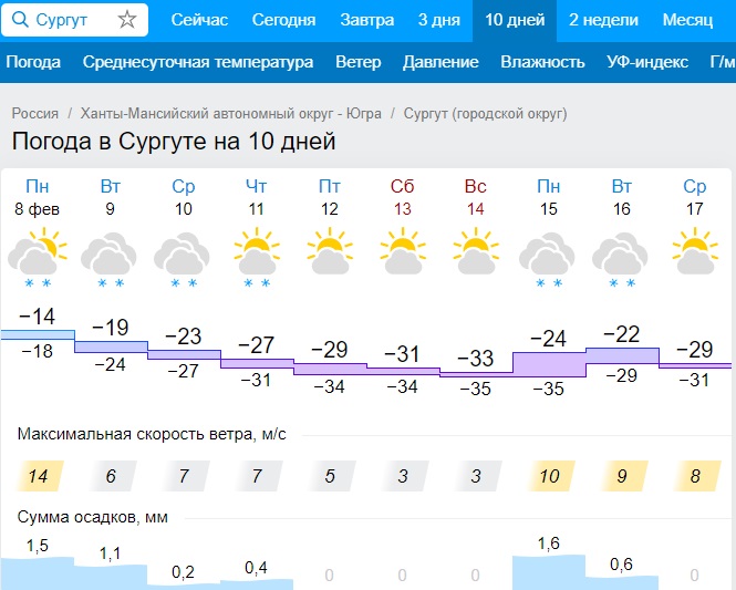 Единая дежурно-диспетчерская служба Сургута предупреждает о неблагоприятных метеоусловиях: днём 8 февраля −14, но из-за ощутимого ветра, до 14 м/с, кажется, что на улице холоднее. Автомобилистам и пешеходам следует остерегаться гололёда.